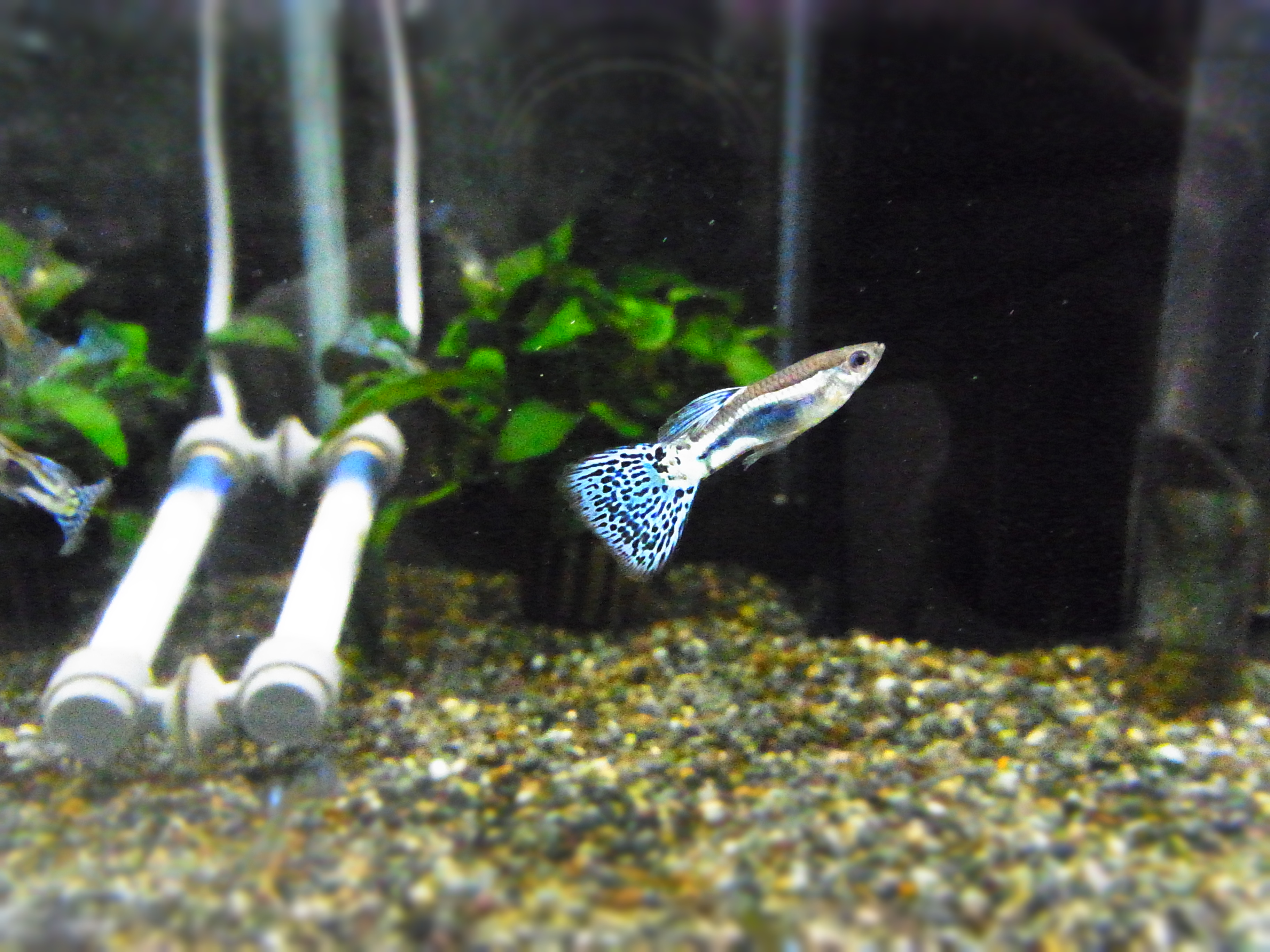 黒の斑模様が入った水色の尾鰭が特徴です。