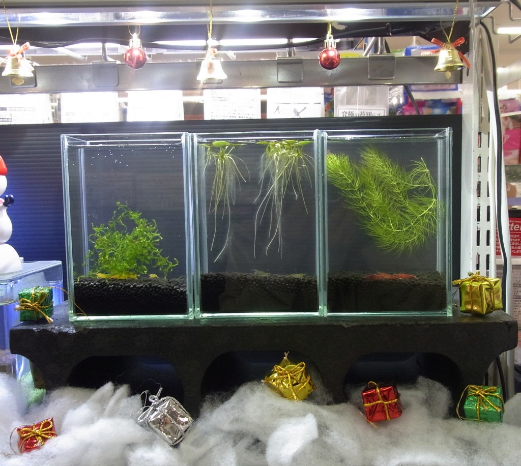 水草とシュリンプが入ったケースを3つに並べてみました。