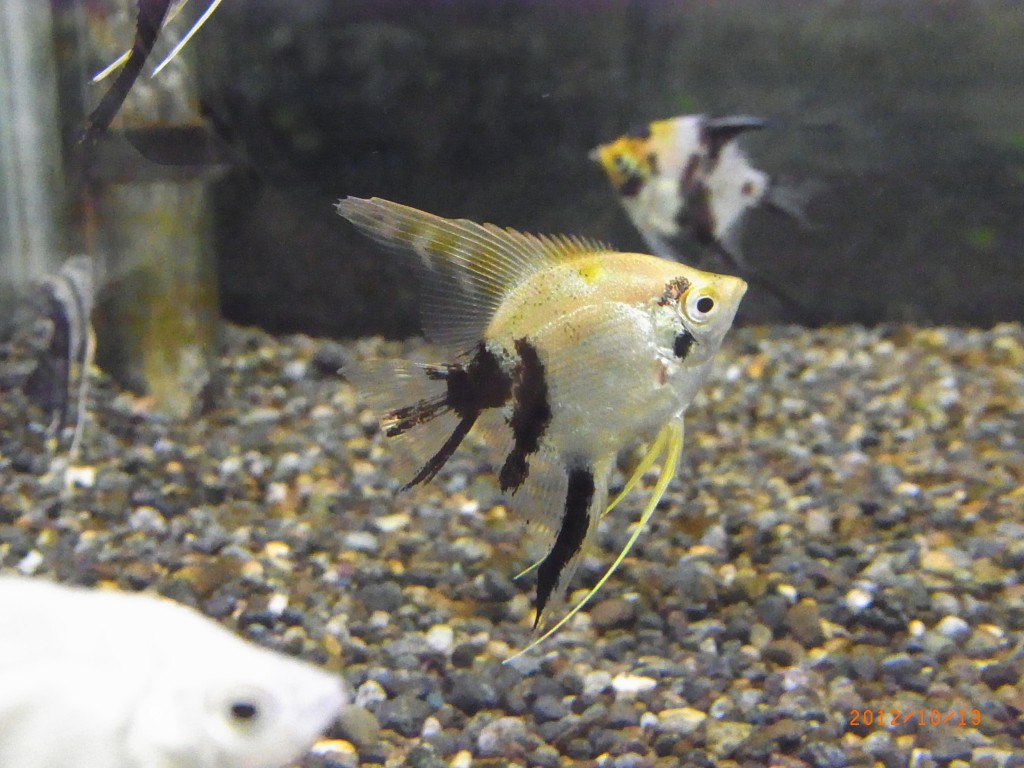 黄色味を帯びた体色に黒の斑模様が入っているエンゼルです。