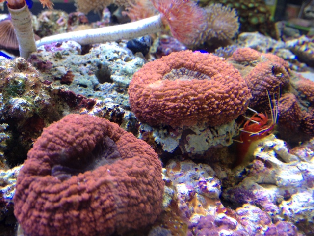 奥にはグリーンのキクメイシと、スーパーピンクのヒユサンゴ