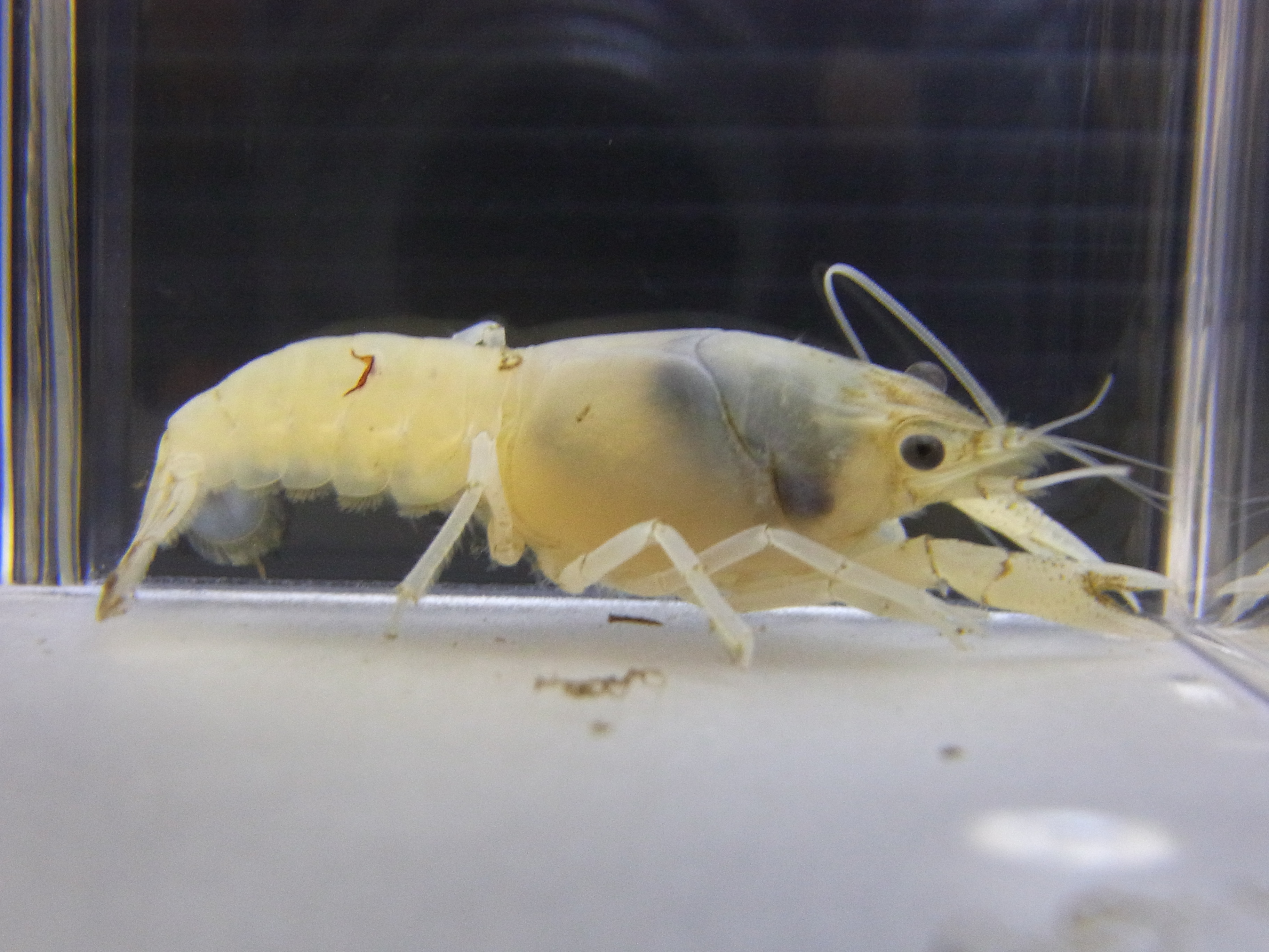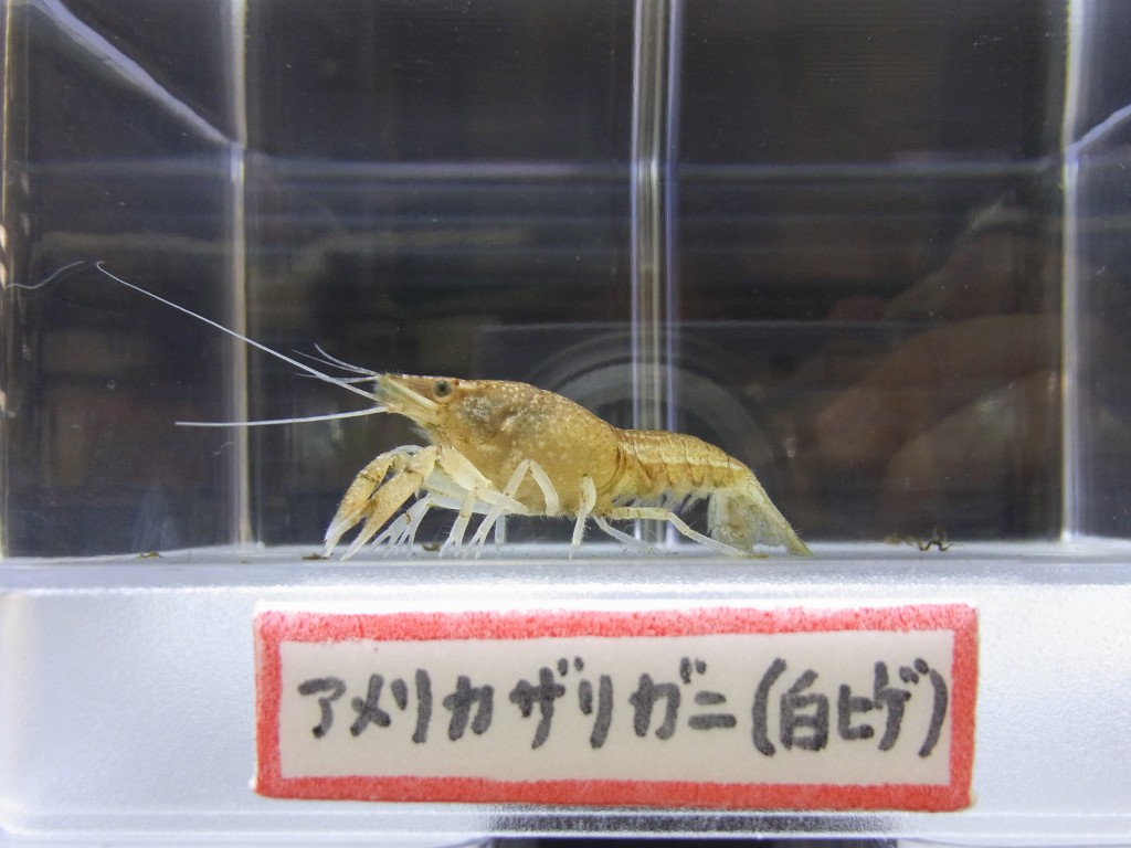 本来赤褐色の長いヒゲが白色になっているザリガニです。