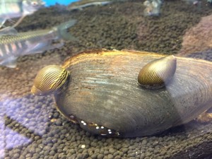 カワシンジュ貝の苔を食べてるシマカノコ貝