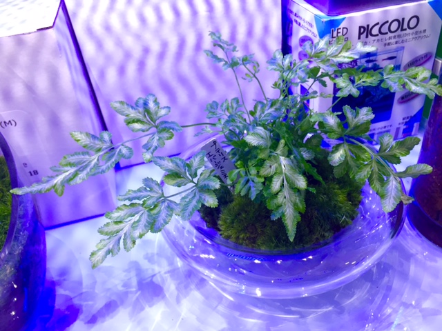 ガラスの美しい器の真ん中にプテリスを植えて